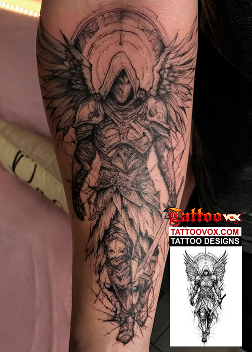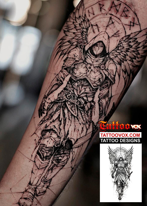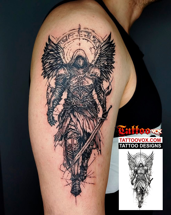 Forged in the confluence of divine power and martial prowess, the Archangel Warrior Knight tattoo design is a profound emblem of spiritual guardianship and unyielding resolve. This intricate motif masterfully blends the celestial majesty of an archangel—evident in the sweeping, feathery wings radiant halo and nimbus of light—with the formidable, armor-clad visage of a medieval knight, complete with a greatsword, and heraldic detailing. It symbolizes a sacred duty to protect, representing a soul armed with both faith and strength, chosen to combat darkness in all its forms. Rendered with dramatic contrast, ethereal light, and meticulous detail in the metallic textures, this tattoo is not merely an image but a declaration of being a warrior for a higher cause, a celestial sentinel eternally bound to a path of honor and divine purpose.