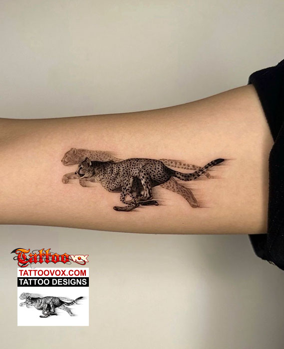 This awesome running cheetah tattoo design captures the essence of speed, power, and grace, making it a striking choice for those who admire agility and determination. The sleek, muscular form of the cheetah in full sprint symbolizes relentless pursuit, freedom, and the ability to overcome obstacles with precision. Depicted with dynamic lines and fluid movement, this tattoo is designed in realistic style—to suit personal taste. Whether inked on the arm, leg, or back, a running cheetah tattoo serves as a bold reminder of strength, ambition, and the wild spirit within.