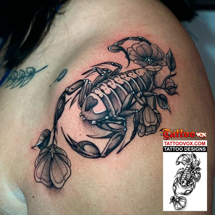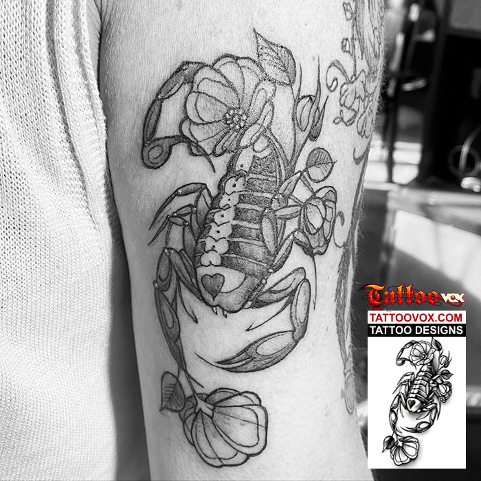 A Scorpion black and grey tattoo design is a bold and symbolic choice, representing strength, resilience, and protection. Rendered in striking shades of black and grey, the scorpion’s intricate details—from its armored exoskeleton to its poised stinger—create a lifelike and menacing effect. This design features realistic shading to enhance depth, making the creature appear as if it’s crawling across the skin. Popular placements for this tattoo include the forearm, shoulder, or back, where the scorpion’s curved tail can flow with the body’s natural contours. Whether chosen for its fierce symbolism or its sleek, timeless aesthetic, a black and grey scorpion tattoo is a powerful statement of survival and intensity.